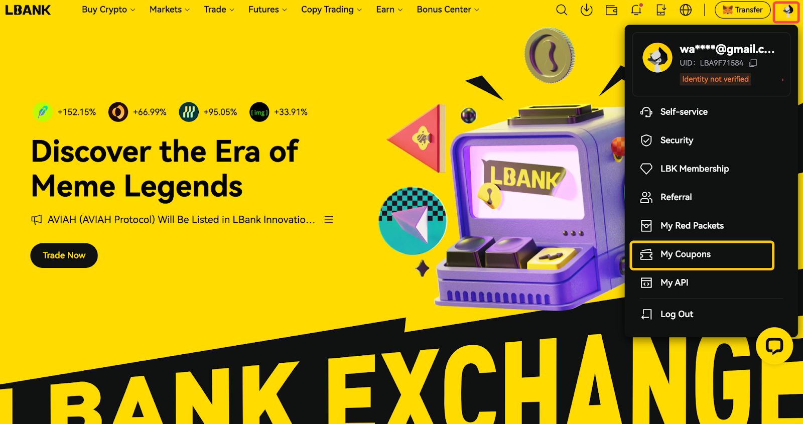 سجل الدخول إلى حسابك على LBank عبر الموقع الإلكتروني. وانقر على [الملف الشخصي] في أعلى اليسار، ثم انقر على [القسائم] من القائمة المنسدلة لعرض مكافآت العقود الآجلة.