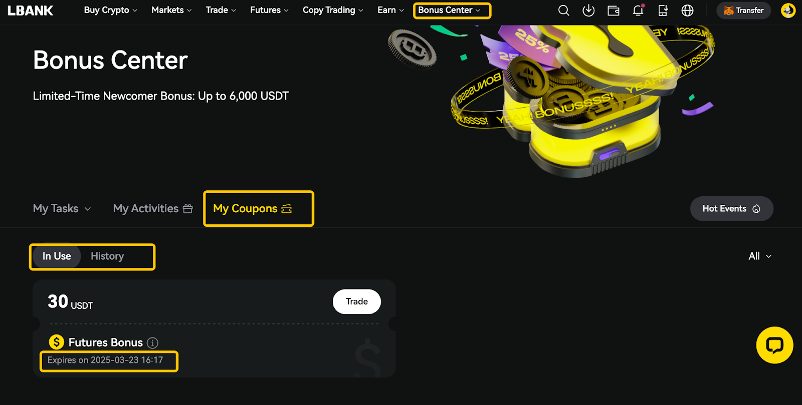 - مكافأة العقود الآجلة لها تاريخ انتهاء صلاحية حاليًا، وستُحذف تلقائيًا بعد انتهاء صلاحيتها. فيُرجى استخدامها قبل انتهاء صلاحيتها، وستجري LBank تعديلات وفقًا لأحداث مُحدّدة.
