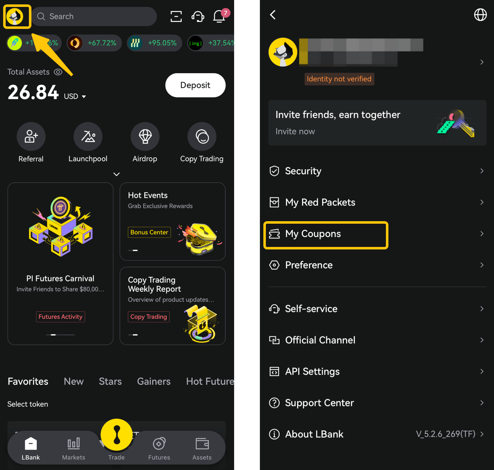 افتح تطبيق LBank وانتقل إلى [الملف الشخصي] في أعلى اليمين، ثم انقر على [القسائم] للاطلاع على جميع مكافآت العقود الآجلة المتاحة.