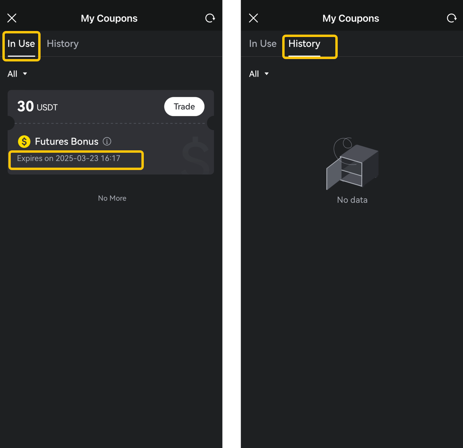 - تُوزّع في شكل قسائم إلى قسم [القسائم]، حيث يحتاج المستخدم إلى النقر على صورته الرمزية - [القسائم] للدخول واستلامها. وستُوزّع مكافأة عقود الآجلة، التي تساوي القيمة الاسمية للقسيمة، على حساب العقود الآجلة في الوقت الفعلي. ويُرجى ملاحظة أن القسيمة لها فترة صلاحية، فاحرص على استخدامها في الوقت المناسب.