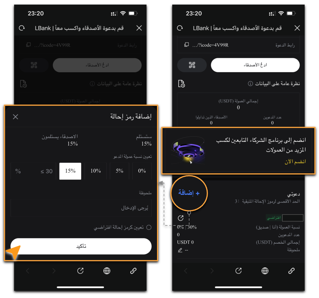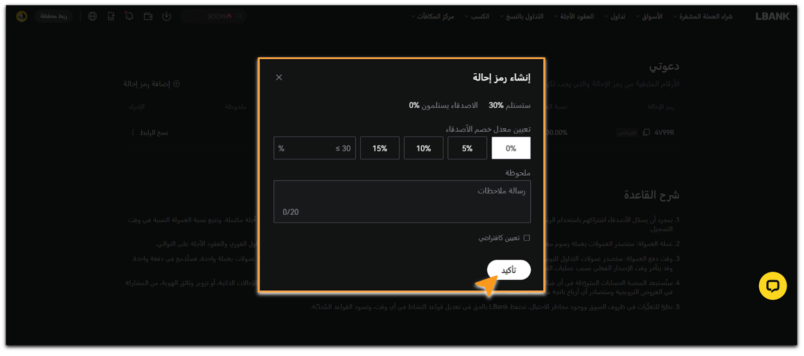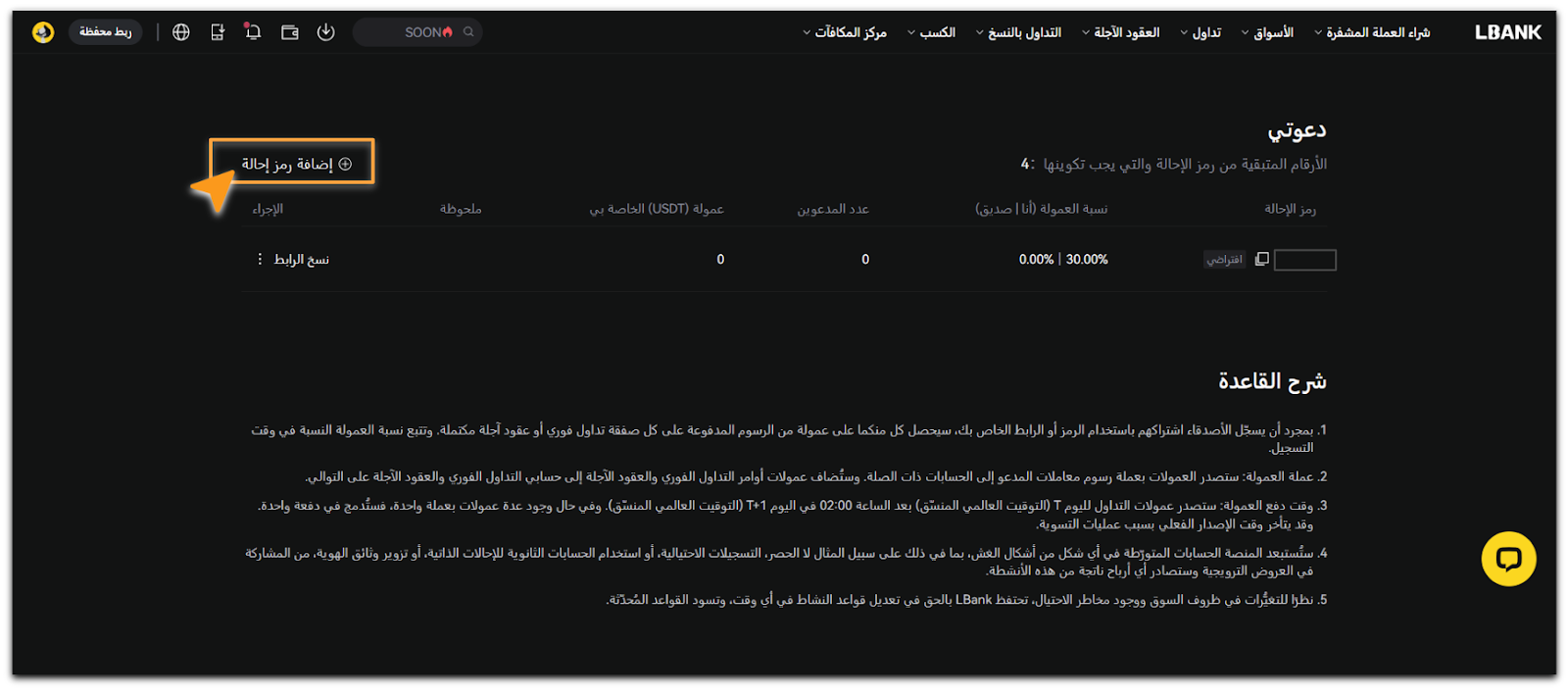 - يجب إدخال رمز الإحالة في أثناء تسجيل الاشتراك الأولي لحساب LBank.