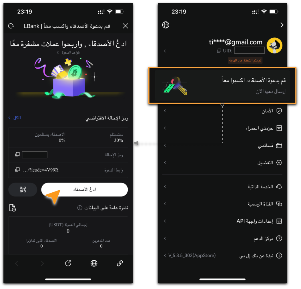 - يمكنك نسخ [رمز الإحالة] أو [رابط الإحالة]، انقر على [دعوة الأصدقاء] للحصول على منشورات قابلة للمشاركة.