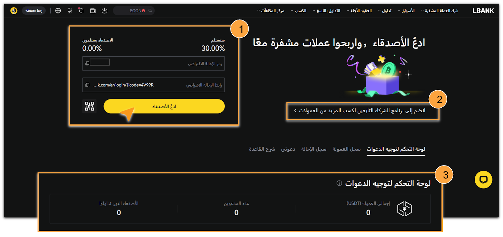 بعد نجاح دعوة مستخدمين جُدد لتسجيل الاشتراك في LBank، يمكن للداعي ربح عمولة من رسوم التداول التي يدفعها المستخدمون الجُدد في سوق التداول الفوري.