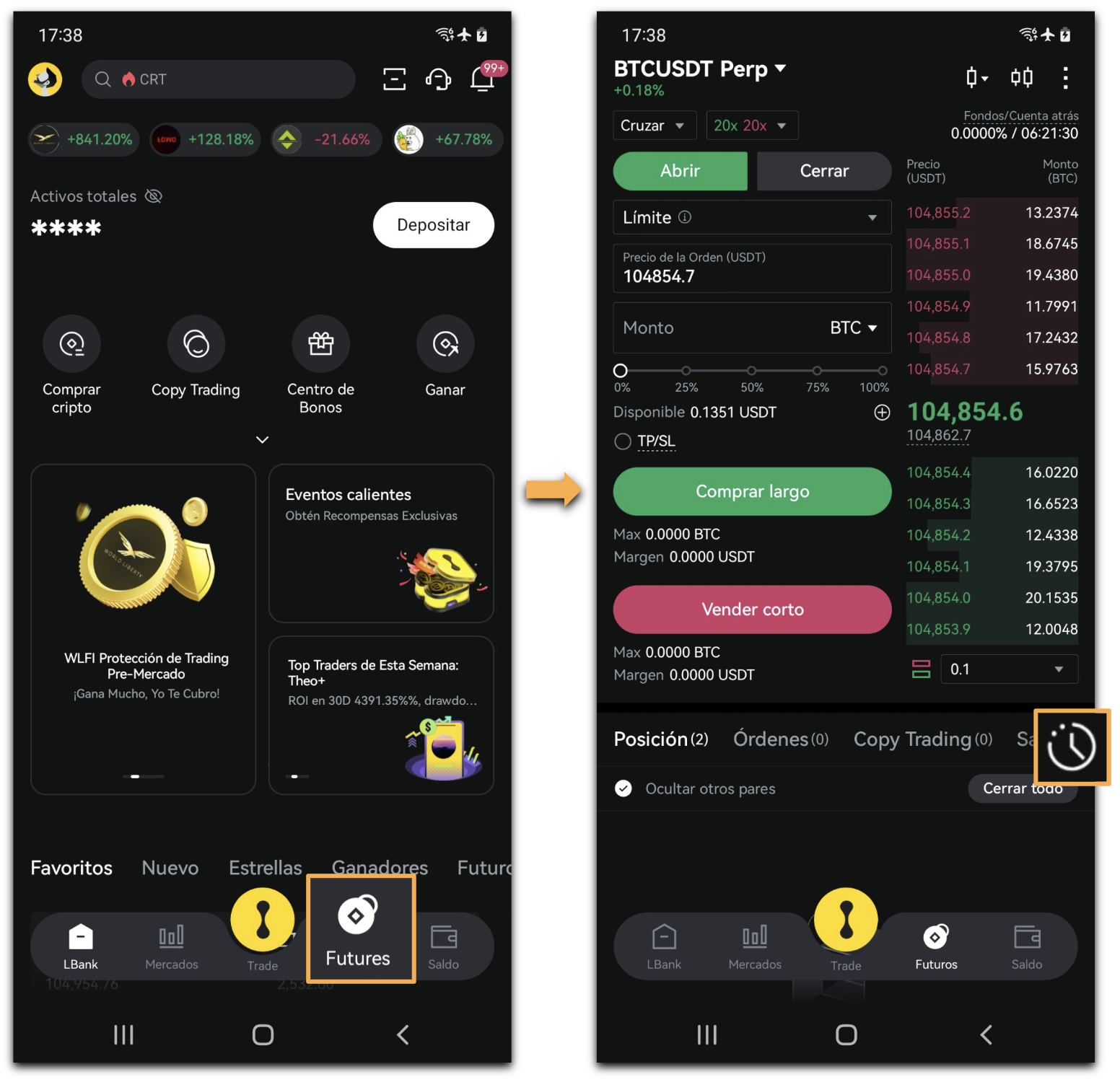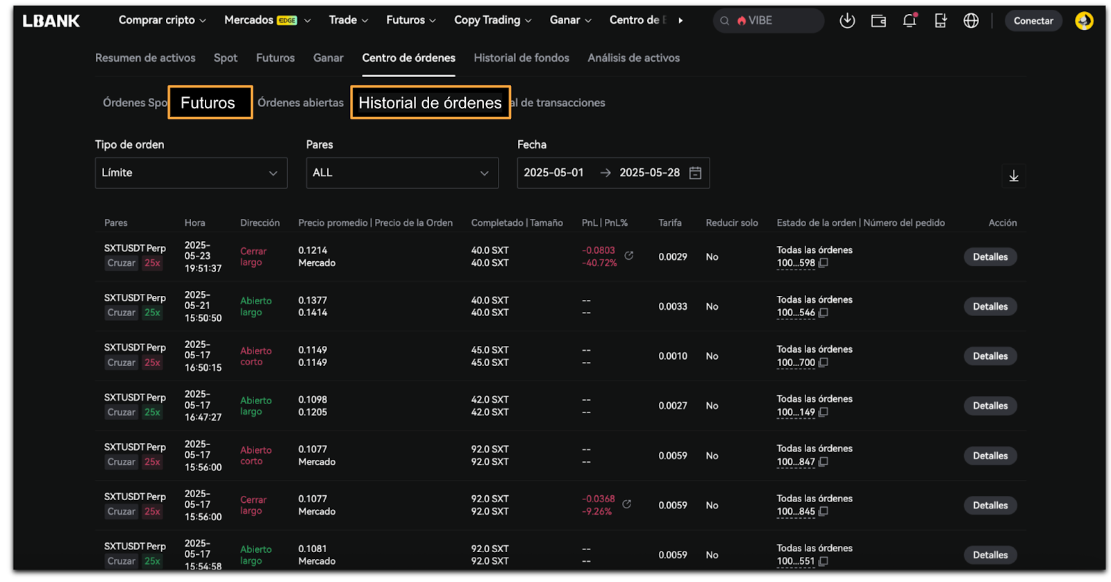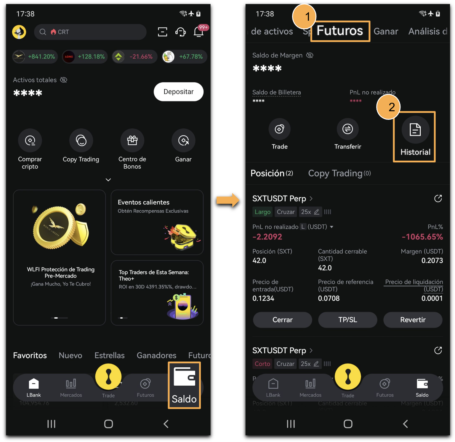 En la App de LBank, puedes consultar el Historial de Órdenes de Futuros desde [Activos] o [Futuros].