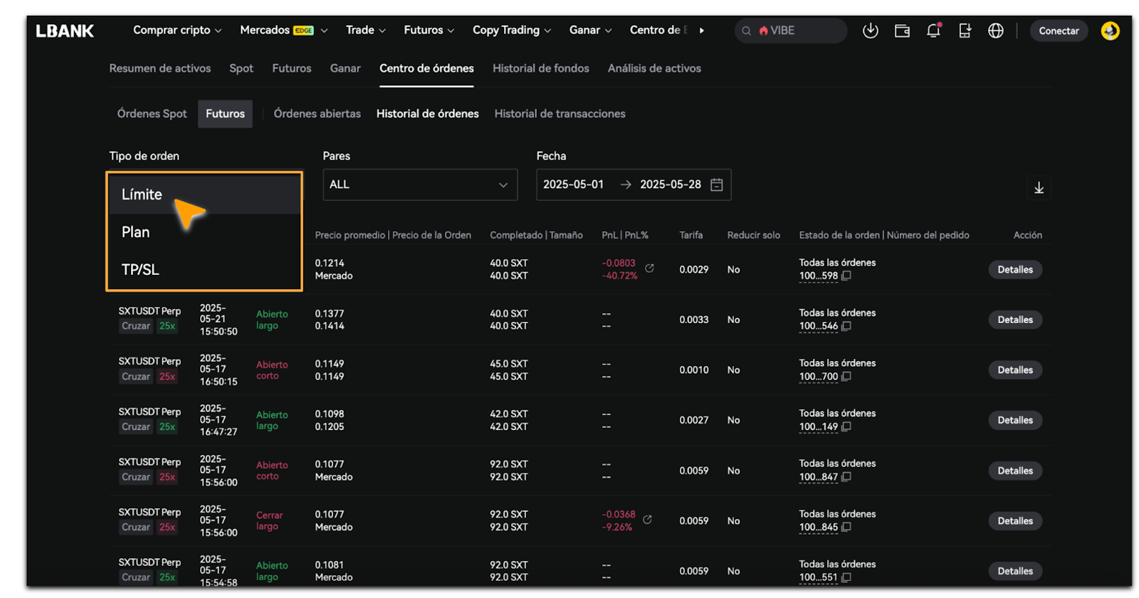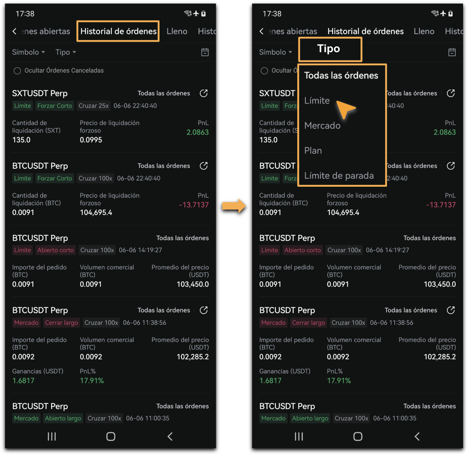 - Pulsa en [Historial de órdenes] y filtra por [Tipo]: Límite, Mercado, Plan y TP/SL.