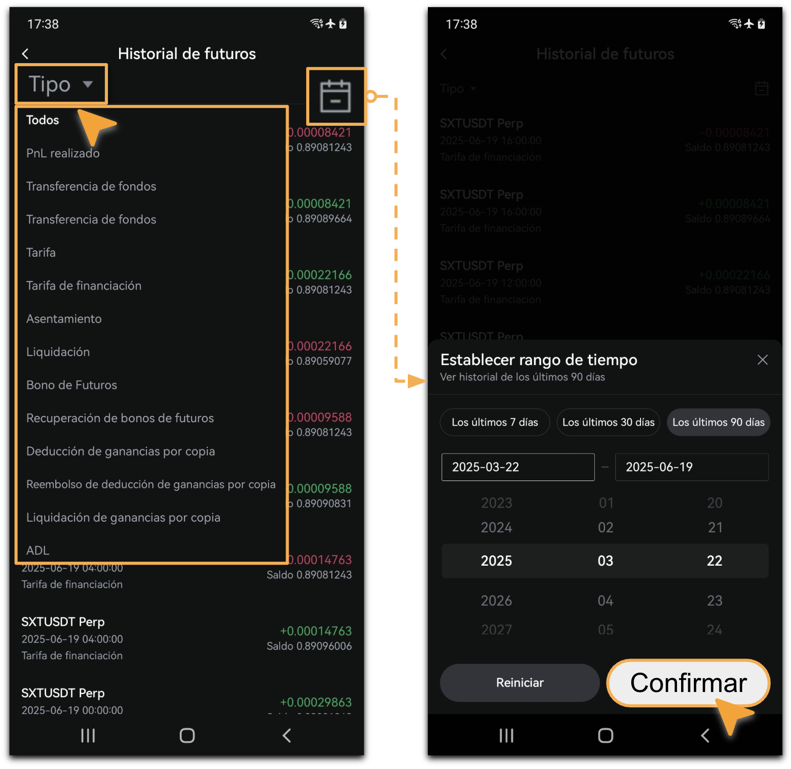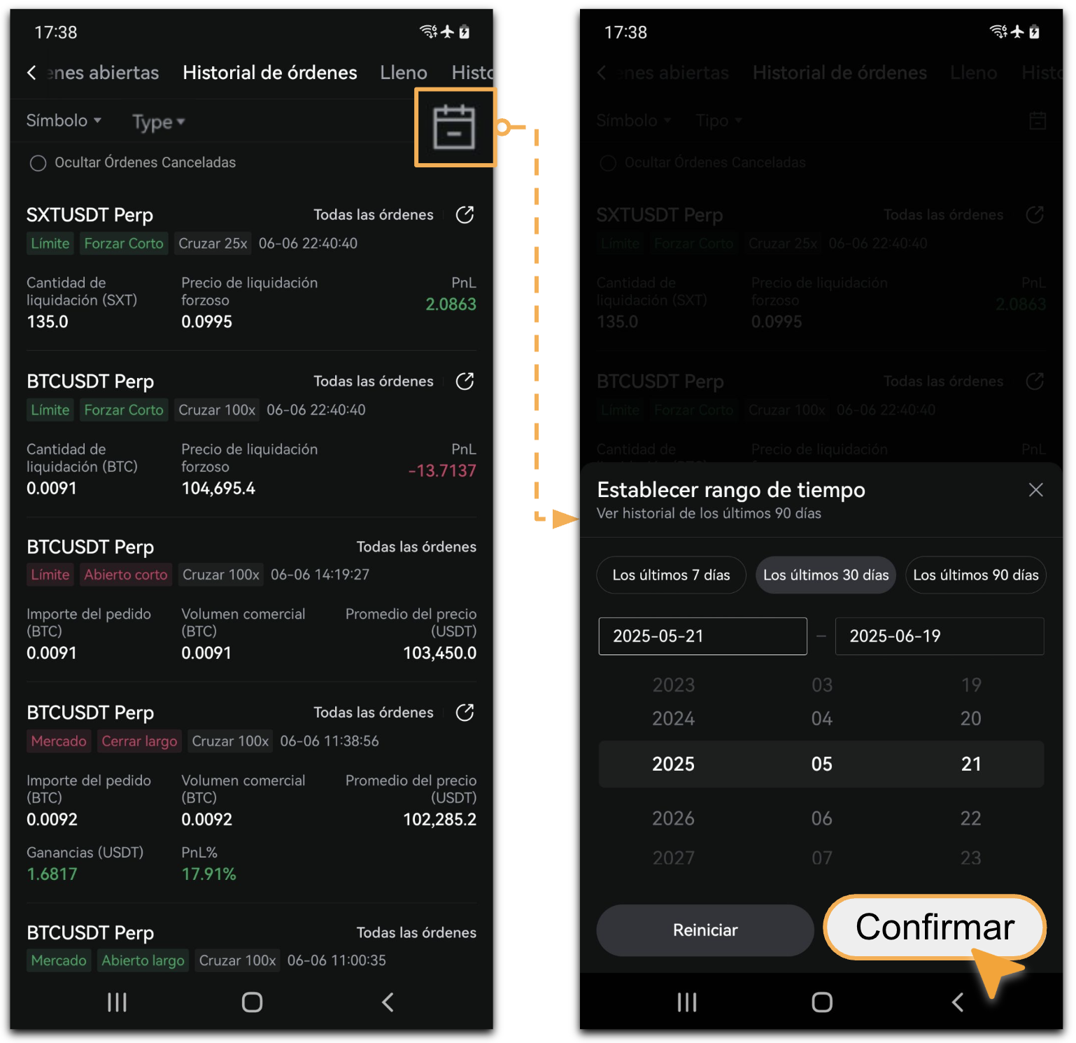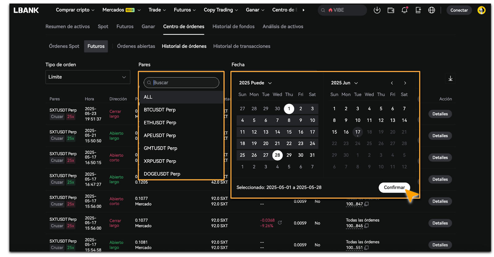 - Selecciona el rango de fechas, pulsa en [Confirmar] para ver tu historial de órdenes de futuros.