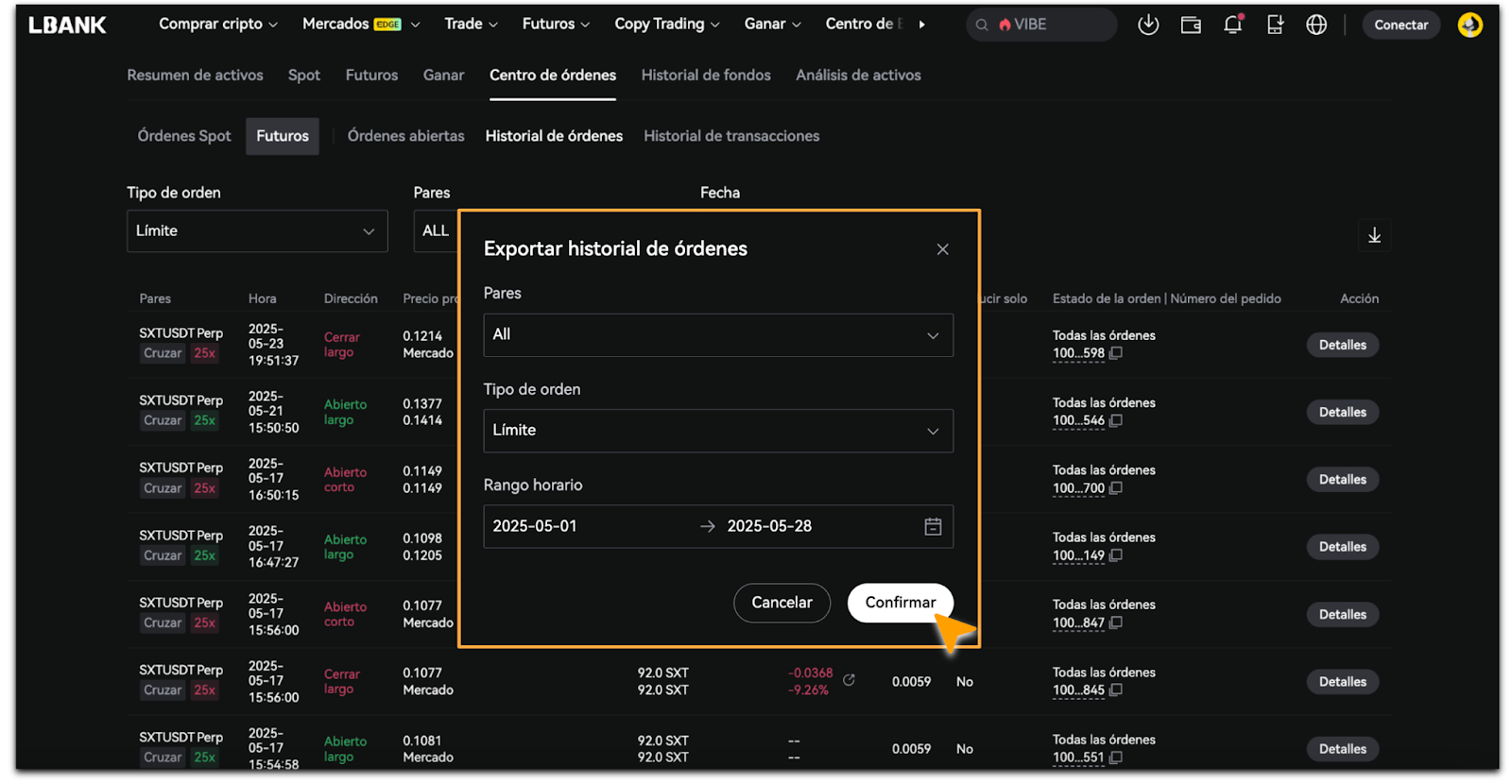 - Pulsa en [⬇️Exportar] para exportar el historial de órdenes. Las condiciones pueden restablecerse si es necesario, pulsa en [Confirmar].