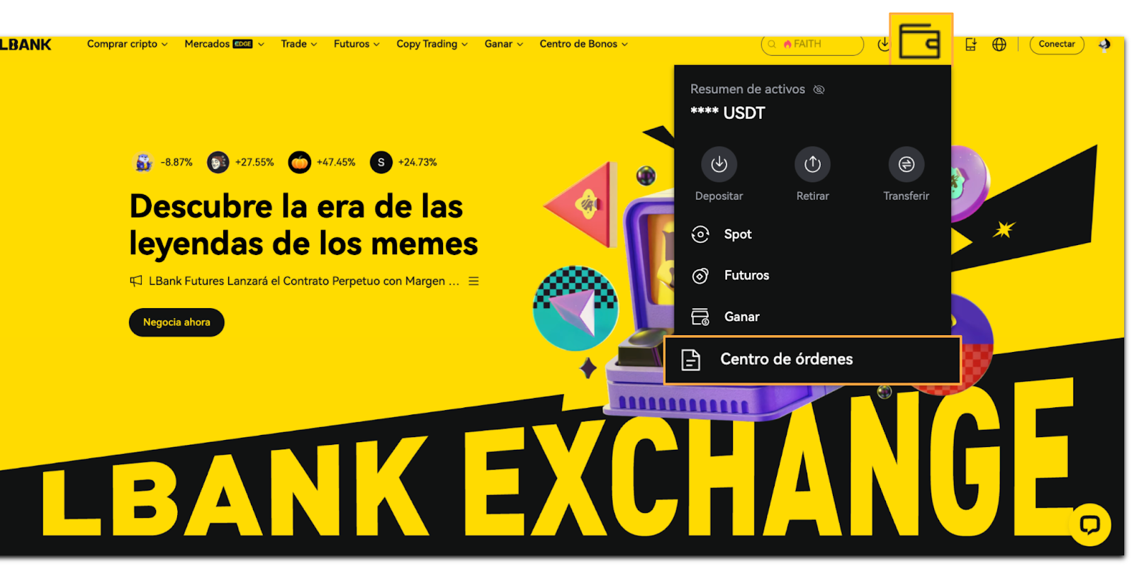 - Ve al sitio web de LBank e inicia sesión en tu cuenta 👉 https://www.lbank.com/es, luego pulsa en [Centro de órdenes].