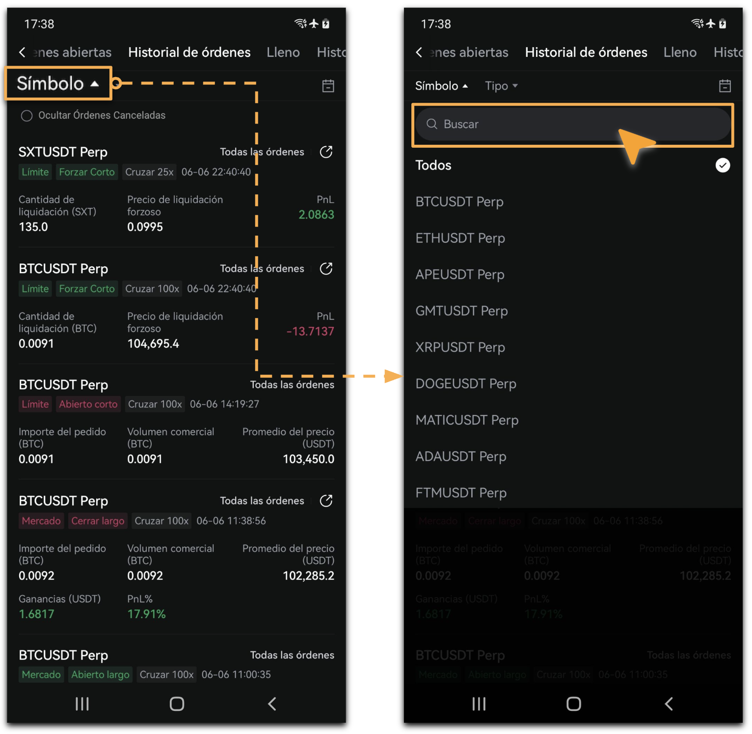 - Pulsa en [Tipo de orden] para filtrar, incluyendo: Límite, Plan y TP/SL.