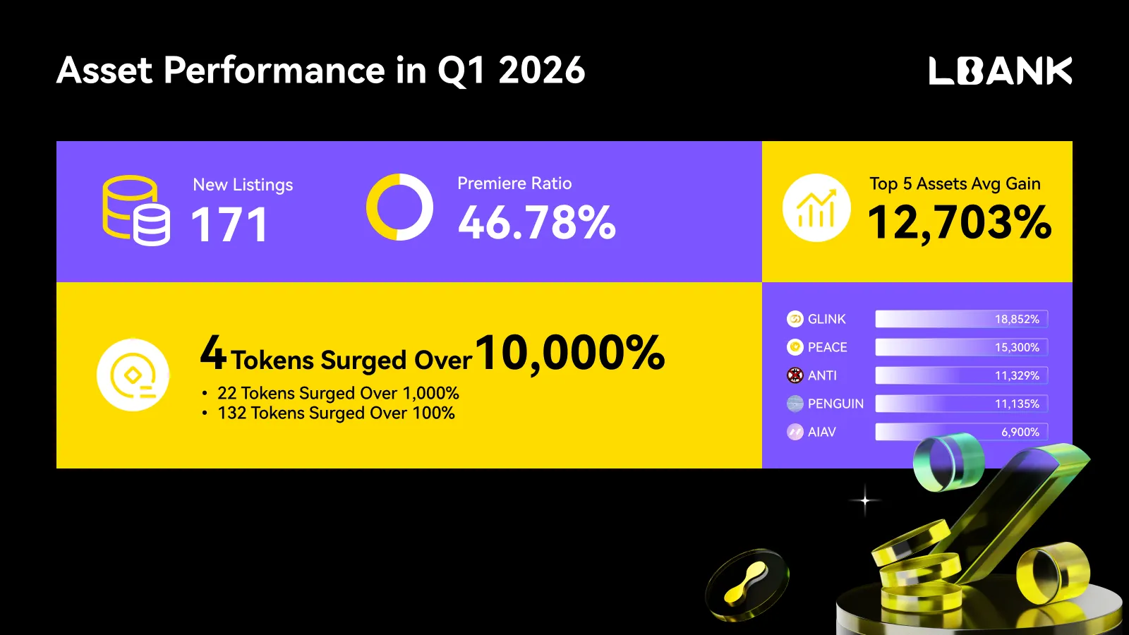 در سهماهه اول سال ۲۰۲۶، پلتفرم ۱۷۱ دارایی نقدی با کیفیت بالا را فهرست کرد، از جمله ۸۰ رونمایی انحصاری که ۴۶.۷۸٪ از کل را تشکیل میداد، و چندین بخش داغ مانند هوش مصنوعی، میم و داراییهای واقعی (RWA) را پوشش میداد. از نظر عملکرد کلی داراییهای تازه فهرست شده، ۵ دارایی برتر به طور متوسط سودی معادل ۱۲۷ برابر کسب کردند. در میان آنها، ۴ توکن با سود ۱۰۰ برابر (۲.۳۴٪)؛ ۱۳۲ دارایی با سود بیش از ۱۰۰٪ (۷۷.۱۹٪) و ۲۲ دارایی با سود بیش از ۱۰۰۰٪ (۱۲.۸۷٪) وجود داشتند. عملکردهای برجسته شامل GLINK (+۱۸,۸۵۲٪)، PEACE (+۱۵,۳۰۰٪)، ANTI (+۱۱,۳۲۸٪)، PENGUIN (+۱۱,۱۳۵٪)، AIAV (+۶,۹۰۰٪) و KELLYCLAUDE (+۷۰۰٪) بودند. این انفجار ساختاری در داراییها نه تنها نفوذ LBank به نقاط داغ بازار را به شکل دقیقی تأیید میکند بلکه مزیت رقابتی مطلق پلتفرم را به عنوان «اولین ایستگاه برای عرضه داراییهای ممتاز» از طریق دقت بسیار بالا در بررسیها برقرار میسازد.