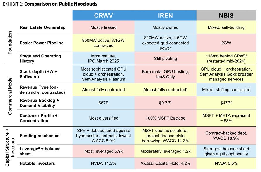 The report compared CoreWeave with peers IREN and Nebius, highlighting differences in scale, infrastructure and financing strategies.