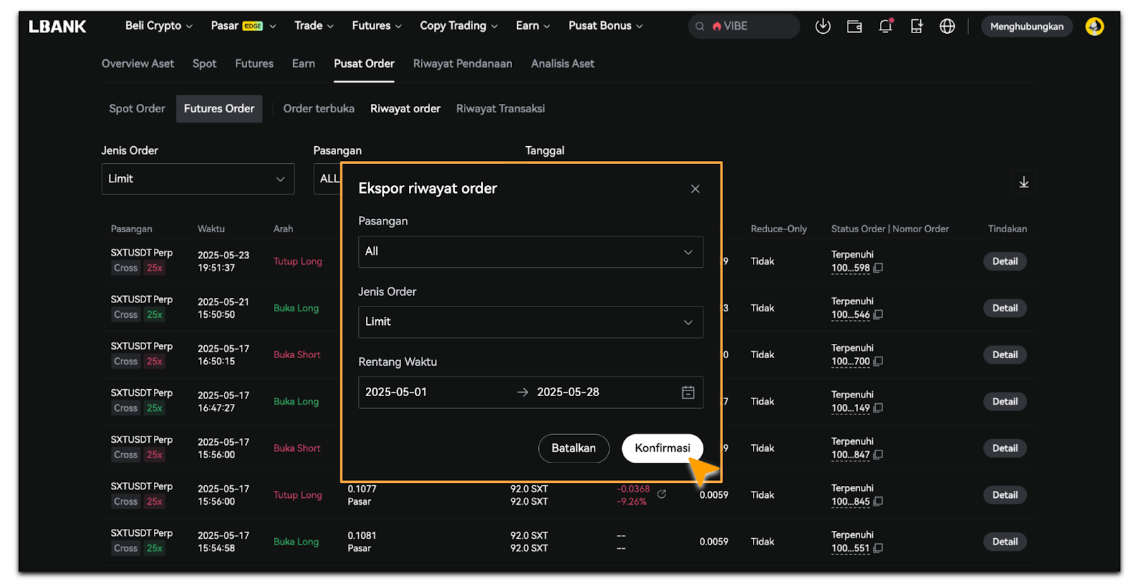 - Kllik [⬇️Ekspor] untuk mengekspor riwayat order. Kondisi dapat diatur ulang jika diperlukan, klik [Konfirmasi].