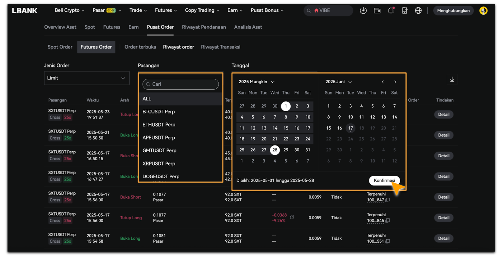 - Pilih rentang waktu, klik [Konfirmasi] untuk melihat riwayat futures order Anda.