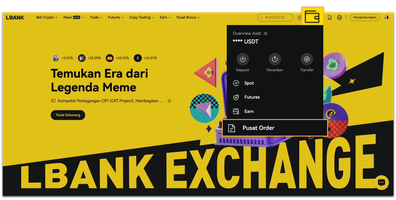 - Buka situs web LBank dan login ke akun Anda 👉https://www.lbank.com/id, lalu klik [Pusat Order].