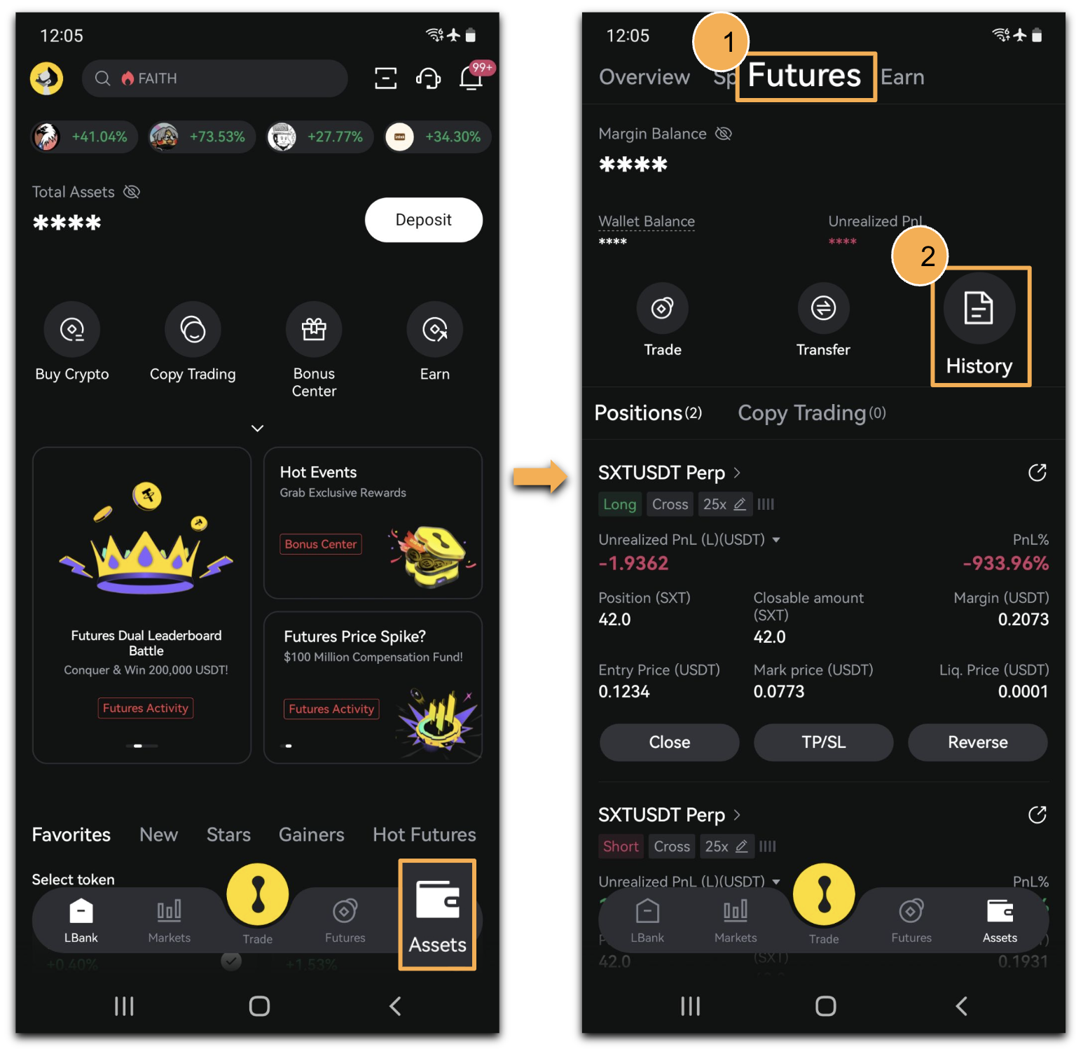 Di Aplikasi LBank, Anda dapat memeriksa Riwayat Futures Order melalui [Aset] atau [Futures].