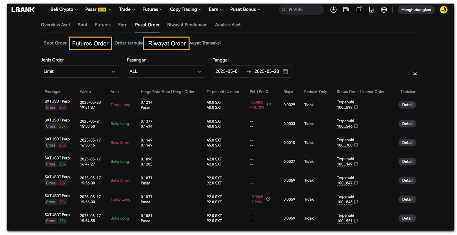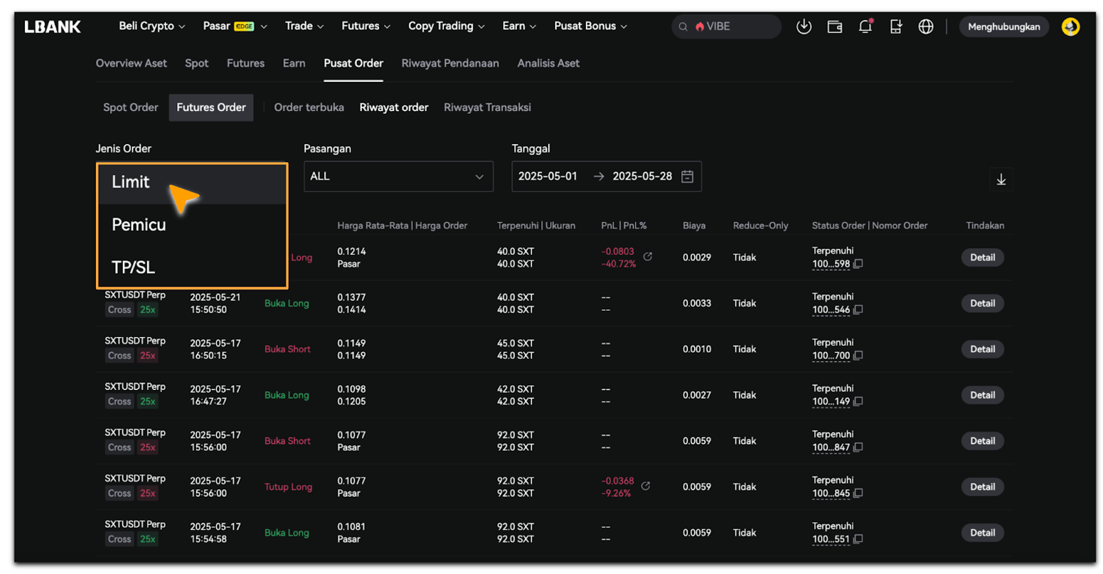 - Klik [Riwayat Order], dan filter berdasarkan [Jenis]: Limit, Pasar, Pemicu, dan TP/SL.