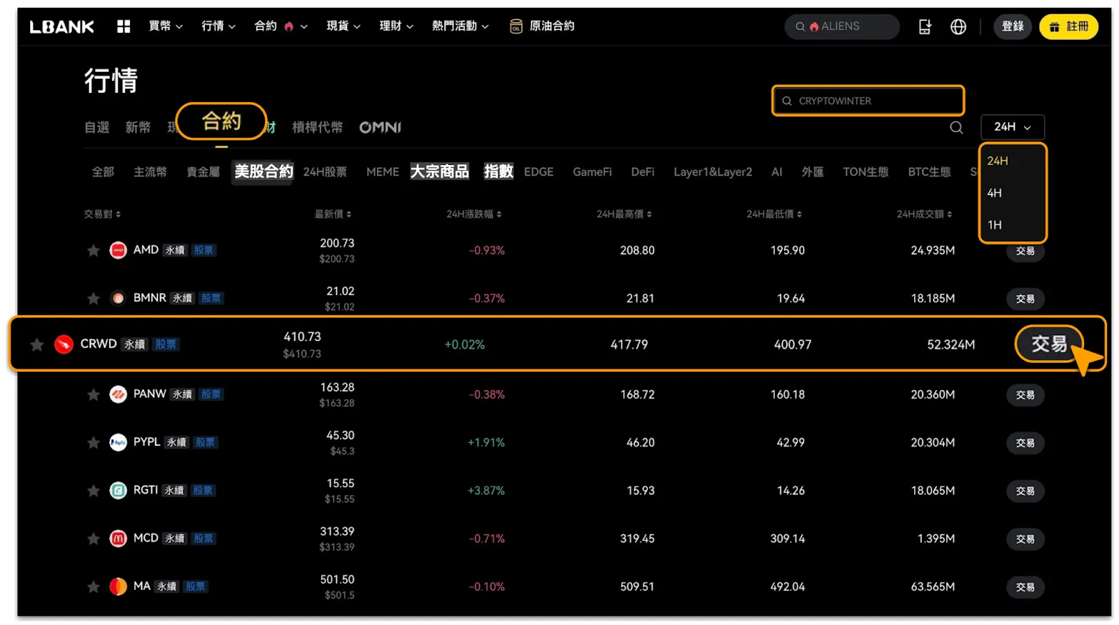 進入頁面後,選擇時間跨度後,瀏覽列表可用標的(如 AAPL-USDT、TSLA-USDT)詳情,包括該交易對的「最新價」、「24H漲跌幅」、「24H最高價」、「24H最低價」以及「24H成交額」;